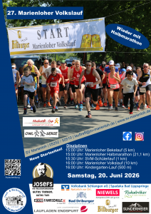 | Samstag, 20.06.2026 | 15:00 Uhr | 27. Marienloher Volkslauf Wieder mit Halbmarathon! 10. Wertungslauf im Hochstift-Cup | Sportzentrum, Neuenbekener Str. 25, 33104 Marienloh |